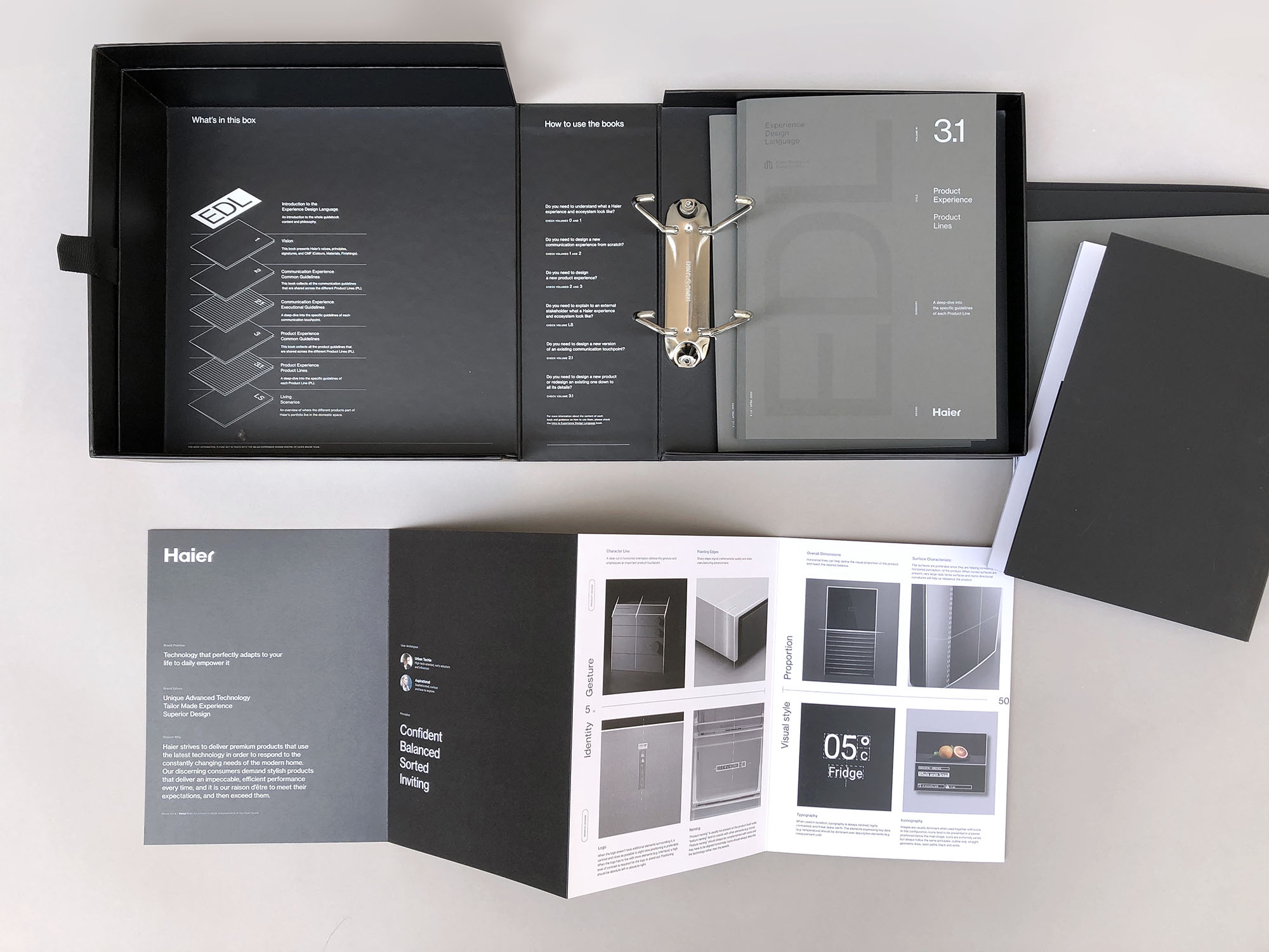 We worked with Haier to develop the Experience Design Language (EDL), a modular and adaptable set of guidelines that captures the essence of the brand. Designed for flexibility and usability, the EDL is structured as a series of volumes that evolve at different speeds, ensuring relevance over time. We introduced the 5-50-5 framework, a spatial reference that helps designers translate the brand consistently across product categories, and built tools that support onboarding, collaboration, and comparison across the company’s broader brand portfolio.